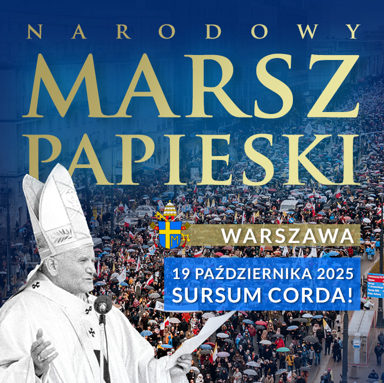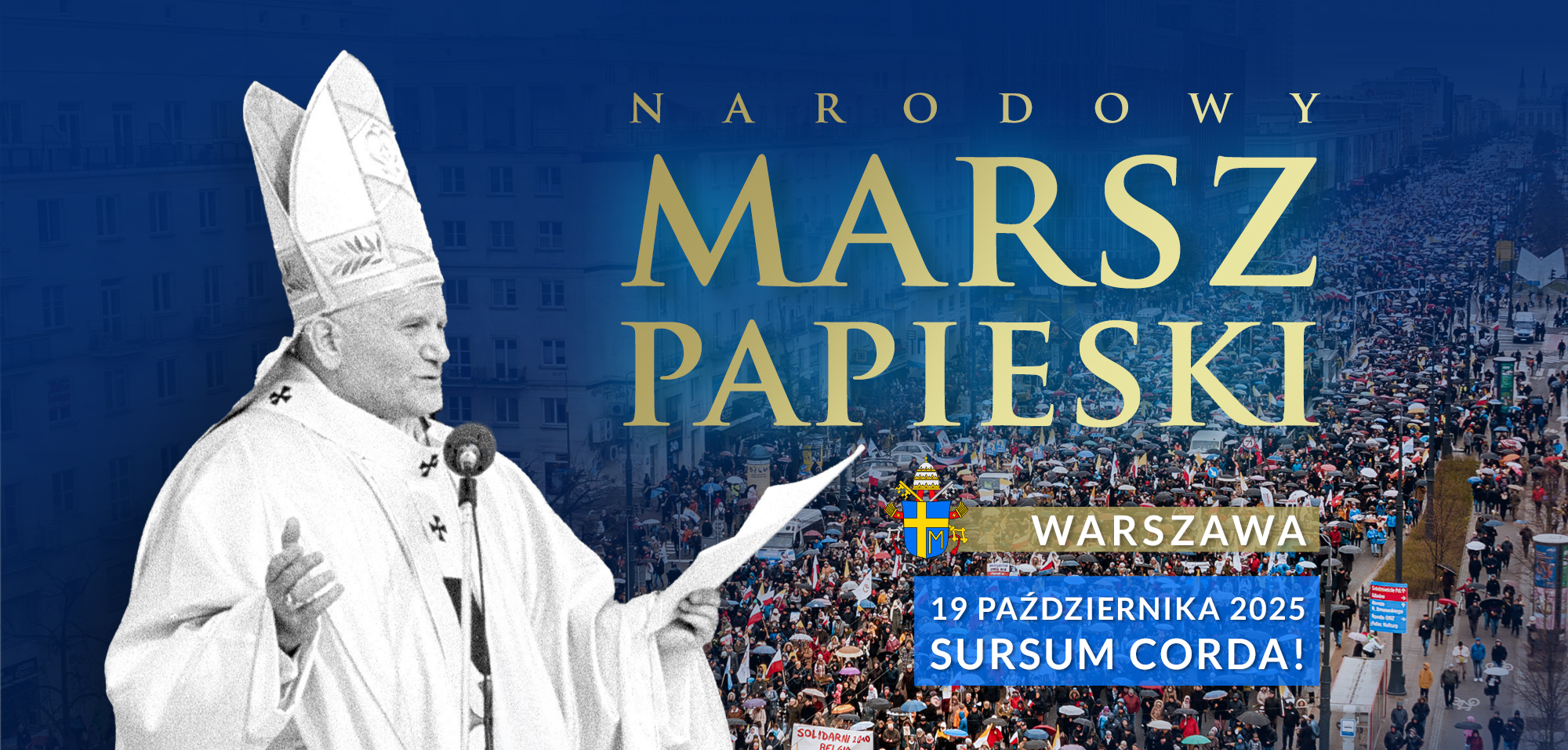 Zapraszamy na Marsz Papieski, który już 19 października 2025 r. przejdzie ulicami Warszawy. Rozpoczniemy Mszą św. w Bazylice Św. Krzyża o godz. 13.00, wyruszymy o godz. 14.00 w kierunku Placu Zamkowego, gdzie pod Kolumną Zygmunta będziemy kontynuować uroczystość.